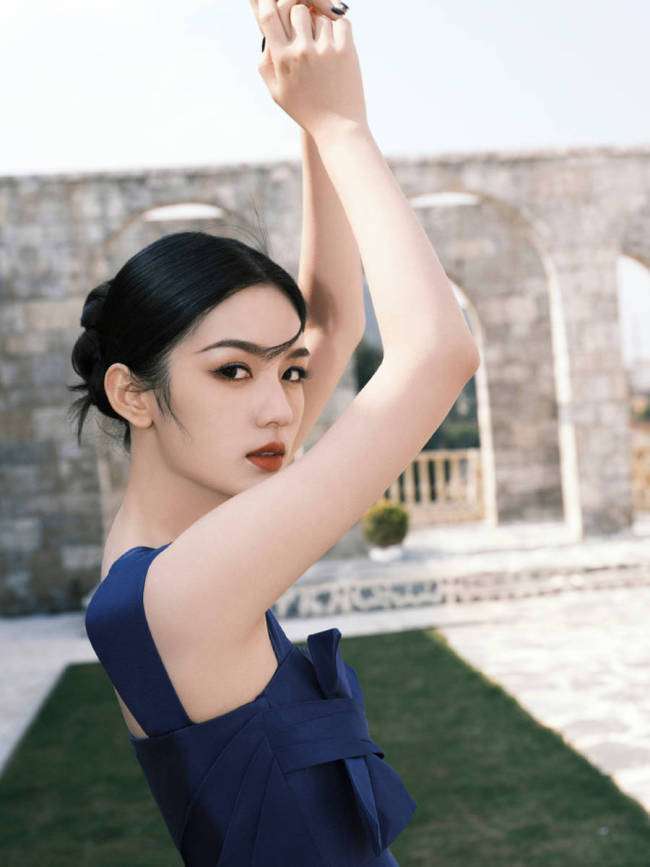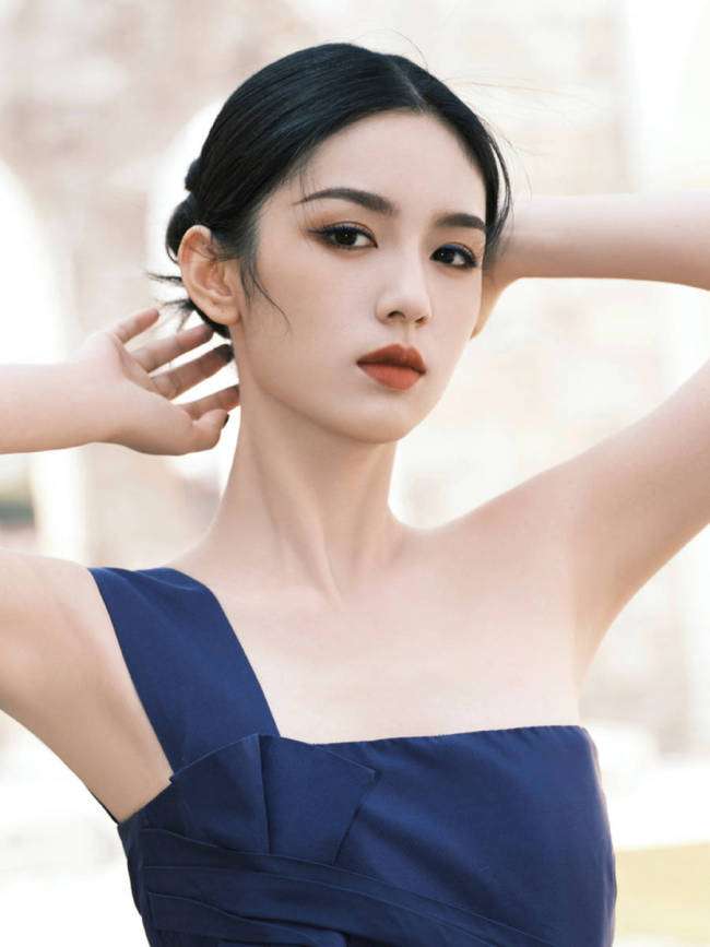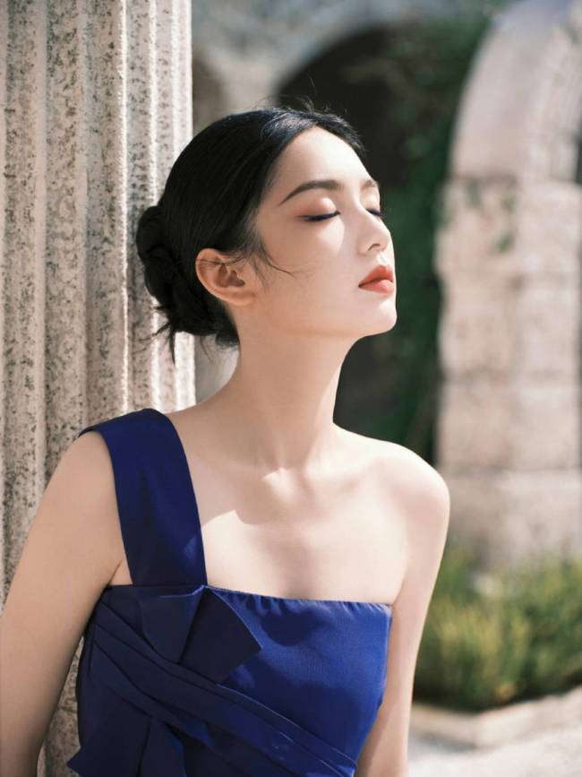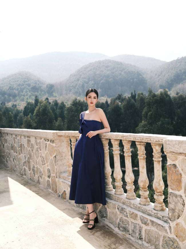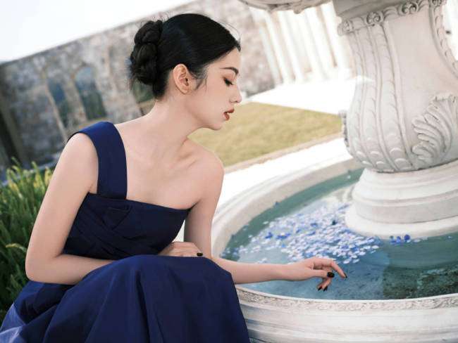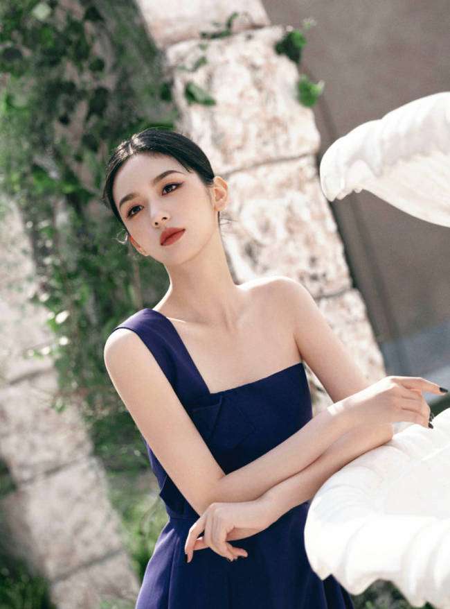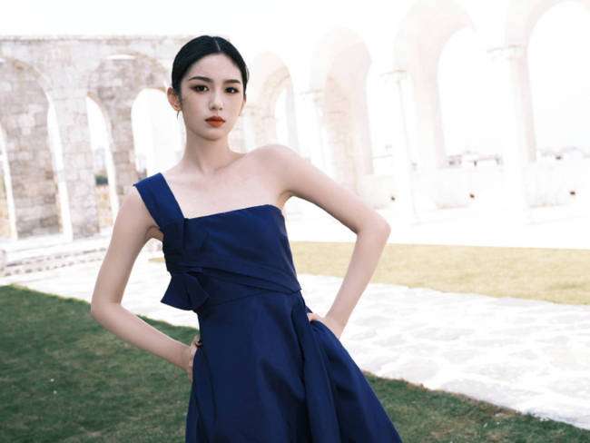 周也现身品牌活动,身穿藏蓝色单肩礼裙优雅又高贵。
