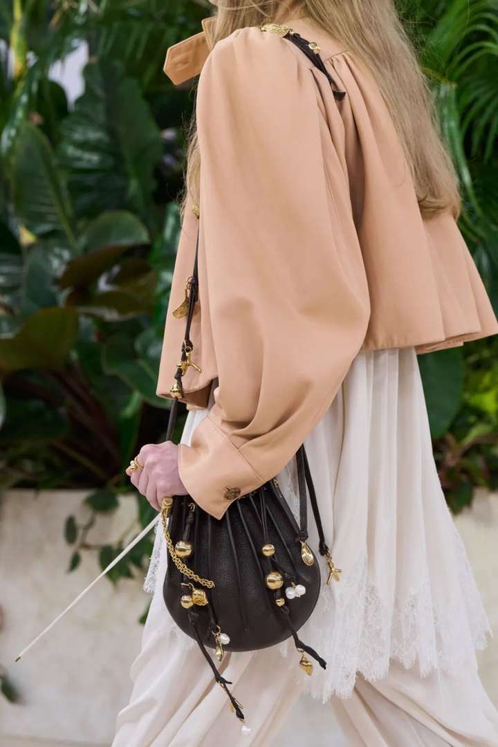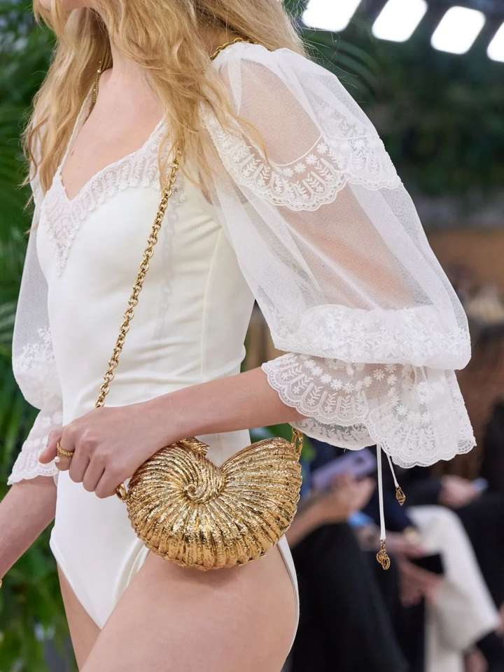 本季包包仿佛专为度假准备的,各种具象化的海螺、贝壳包,加上巴洛克珍珠的点缀,主要起到一个造型的作用。