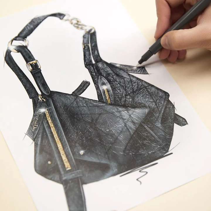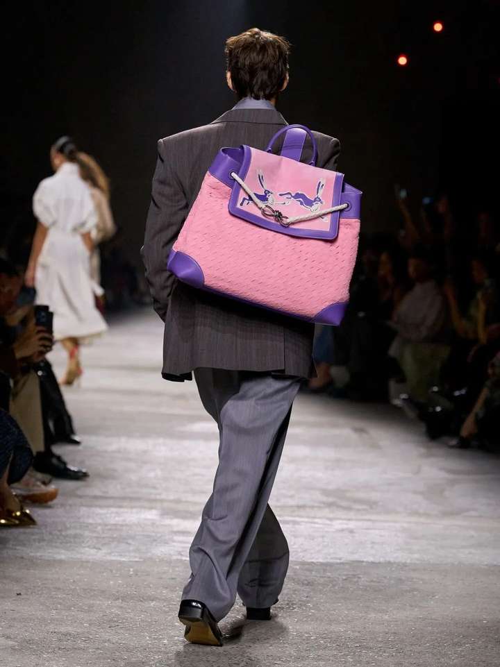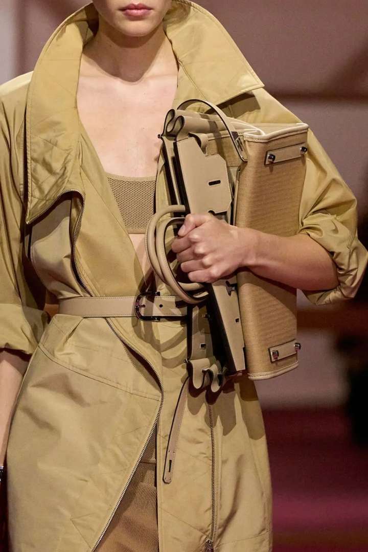 灵感来源于包包制作过程的最后一个步骤,即还原了包包内胆完全反转过来的样子,非常解构主义。